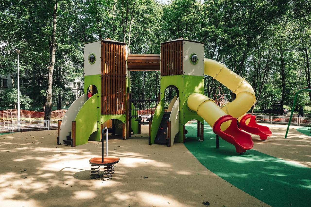 На площадках есть резиновое покрытие, игровые элементы для детей разных возрастов, камеры видеонаблюдения, подключенные к системе «Безопасный регион», а также скамейки и урны.