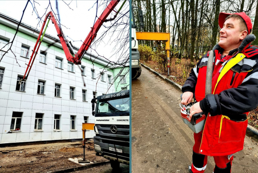 Строители усилили колонны, установили несъемную опалубку, металлокаркас. Бетон для заливки перекрытий подается через второй этаж с помощью спецмеханизмов и отдельного оператора, управляющего умной системой подачи.