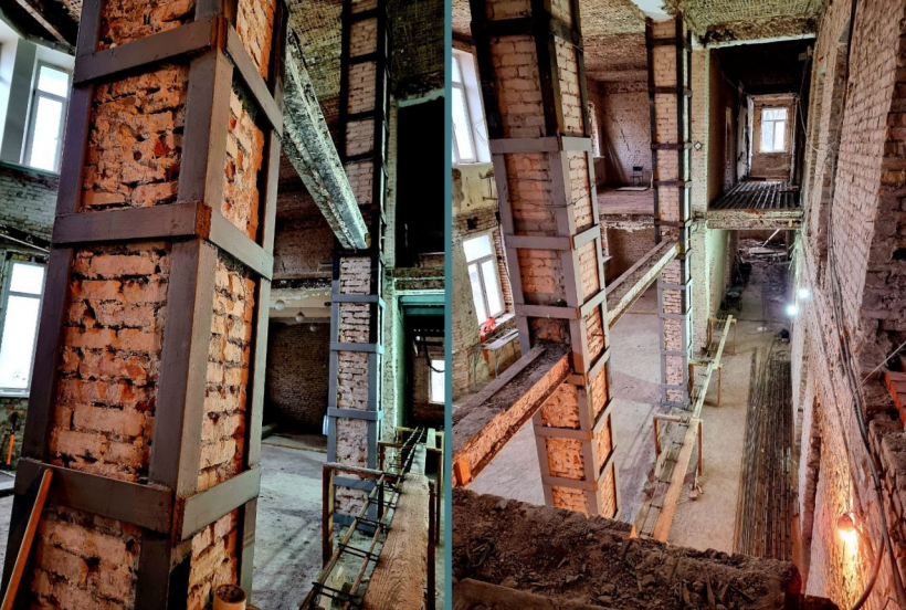 Для заливки используется бетон марки В25, он отличается прочностью и качеством. Через трое суток после заливки в лабораторию отправят бетонные кубики для проведения независимой экспертизы. Это обязательное условие работ. После бетонирования перекрытий планируется усиление проемов дверей и кирпичная кладка перегородок.