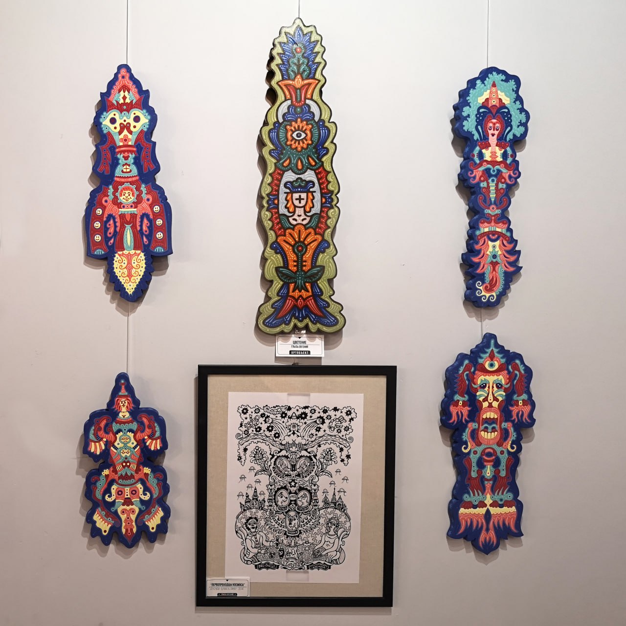 Часть выставки состоит из работ Евгения Глызя, автора Черневской игрушки. Он сделал предметы из дерева и украсил их знаками и символами современного мира.
