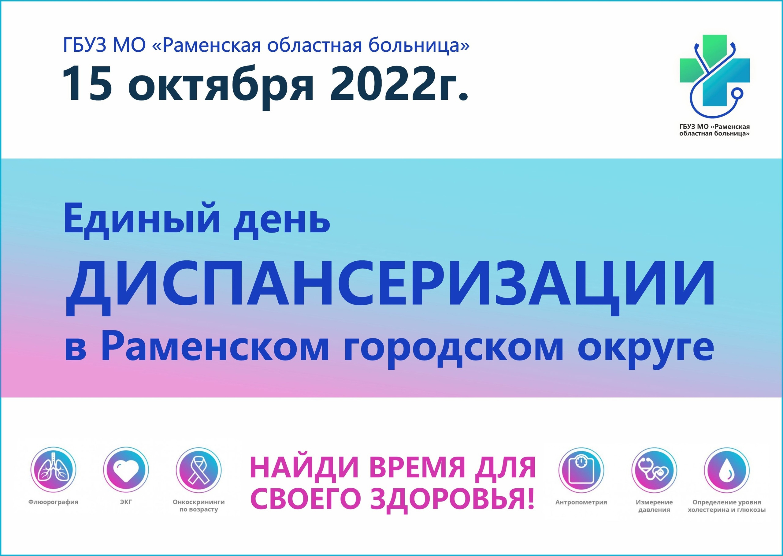 В поликлиниках и амбулаториях Раменской областной больницы в субботу, 15 октября, пройдет единый день диспансеризации. Во время первого этапа обследования пришедшим предстоит проконсультироваться с врачами и сдать анализы.