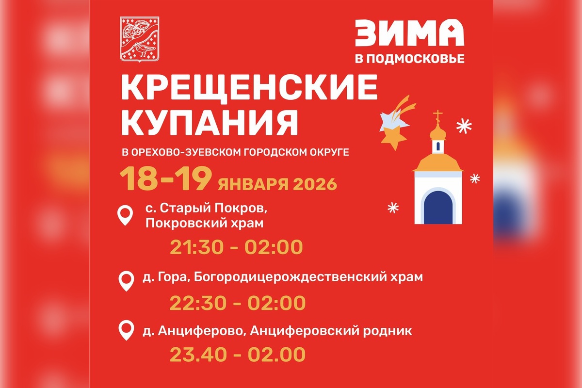 Так, в этом году в Орехово-Зуеве места для крещенских купаний будут оборудованы на территории Богородицерождественского собора и на карьере «Амазонка». Кроме того, купели будут вблизи Покровского храма в деревне Старый Покров и Богородицерождественского храма в деревне Гора (бывш. Горский ТО), в пруду «Восьмерка» в деревне Малая Дубна и Анциферовском роднике в деревне Анциферово, а также прорубь на озере вблизи деревни Дуброво.