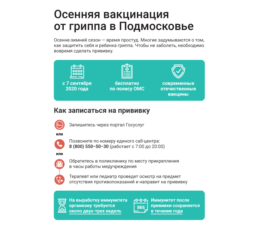 Обезопасить себя от гриппа и ревакцинироваться от ковида красногорцы могут бесплатно по полису ОМС в поликлиниках ГБУЗ МО «Красногорская городская больница №1».