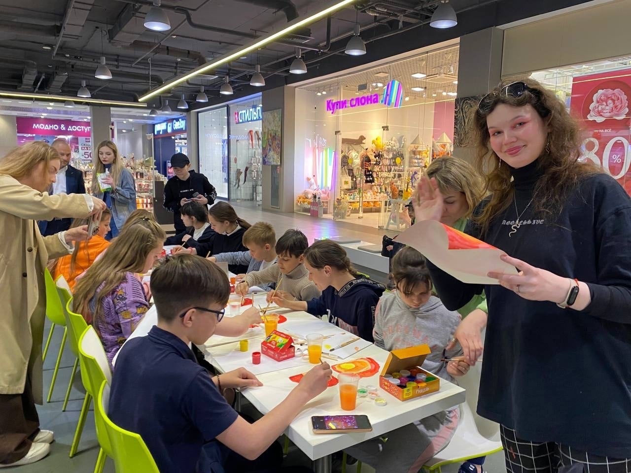 На первом этаже ТЦ работала импровизированная художественная студия, где студенты института искусств РГУ имени А.Н. Косыгина учили детей рисовать.