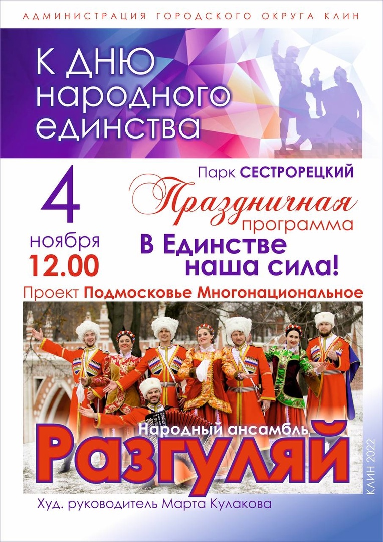 Г.о. Клин 4 ноября вместе со всей Россией будет праздновать День народного единства. В Сестрорецком парке гостей ждет праздничная программа «Подмосковье многонациональное».
