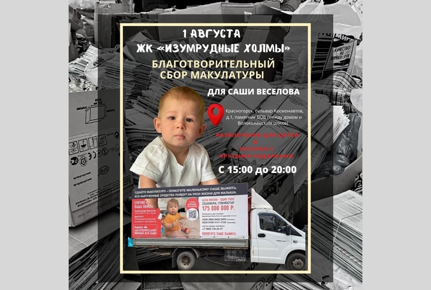 1 августа с трех часов дня и до восьми часов вечера в Красногорске будет проходить благотворительная акция в поддержку Саши Веселова в ЖК «Изумрудные холмы» по адресу: бульвар Космонавтов, д.1, памятник ВОВ (между домом и волоколамкой).