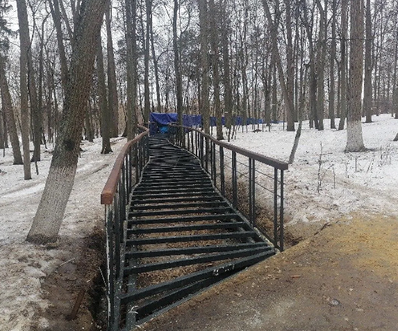 На данный момент рабочие уже смонтировали стальные конструкции настилов пешеходных дорожек, сцены, также частично установлены малые архитектурные формы, павильоны, детские площадки, была сделана обрезка и формирование крон деревьев.