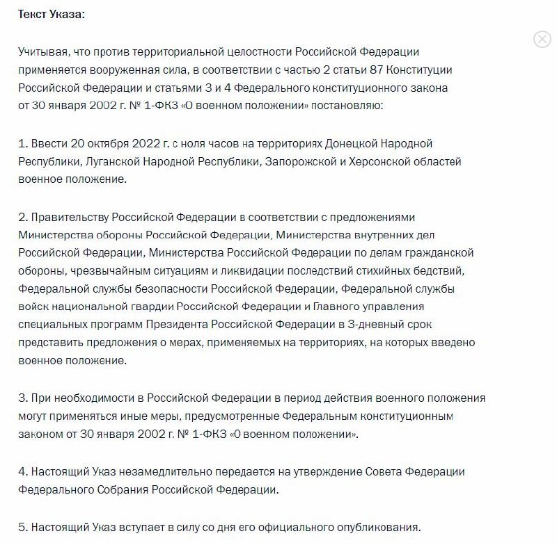 Пресс-службой Кремля был опубликован подписанный президентом Владимиром Путиным документ, в соответствии с которым на территории Донецкой и Луганской народных республик, Херсонской и Запорожской областей вводится военное положение.