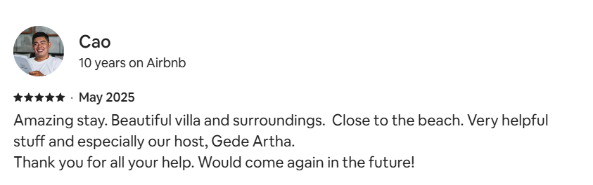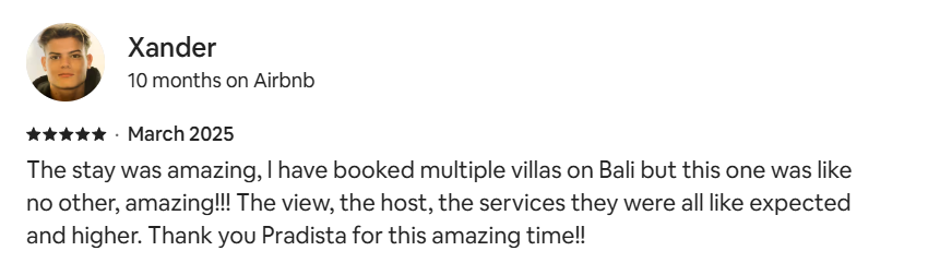 «Пребывание было потрясающим! Я бронировал множество вилл на Бали, но эта была просто невероятной!!! Вид, хозяин, обслуживание — всё было на высшем уровне, даже лучше, чем ожидалось. Спасибо за это чудесное время!»