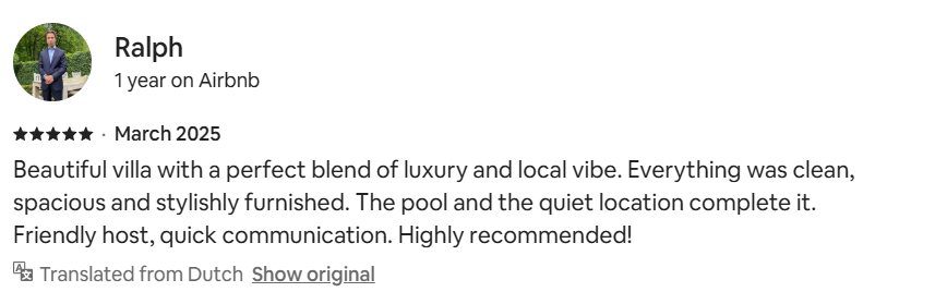 «Прекрасная вилла, идеально сочетающая роскошь и местный колорит. Все было чисто, просторно и стильно обставлено. Бассейн и тихое местоположение дополняют картину. Приветливый хозяин, быстрая связь. Настоятельно рекомендую!»