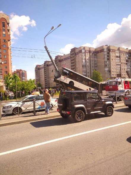 Автобус вышел из-под контроля водителя и буквально повис на опоре ЛЭП на Ленинском проспекте, а перед этим сбил пешехода.