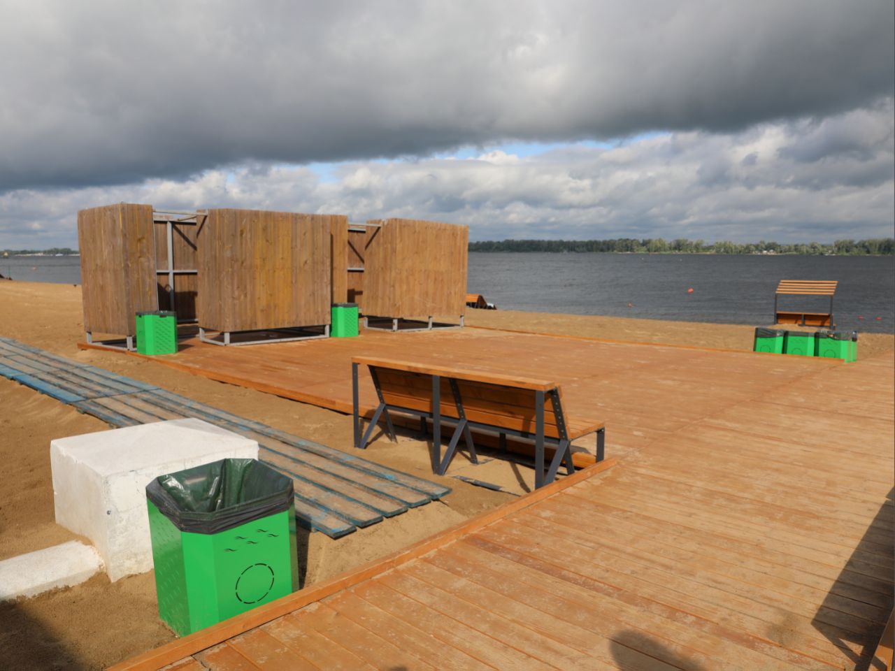 Сотрудники «Самарской набережной» уже смонтировали скамейки-шезлонги, теневые навесы, пляжные настилы и душевые открытого типа — они появились впервые. Более 90% закупленного оборудования и мебели установлено.