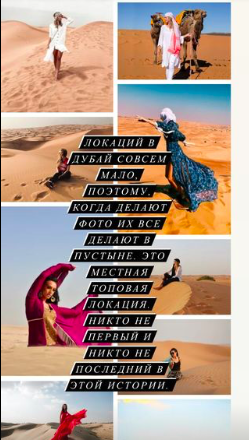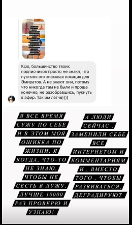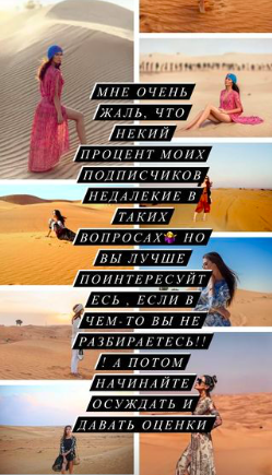 В сторис Бородина выложила коллаж, составленный из подобных фотографий, сообщив, что в Дубае мало локаций для съемок. Она посетовала, что некоторые ее подписчики достаточно недалекие, чтобы судить, не разобравшись в вопросе.