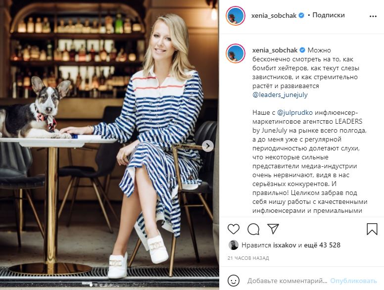 Ксения Собачак и ее подруга Юлия Прудько являются совладелицами маркетингового и PR-агентств. Теледива воспевает успехи своего бизнеса в соцсетях. По словам Собчак, агентство Leaders «стремительно растет и развивается».