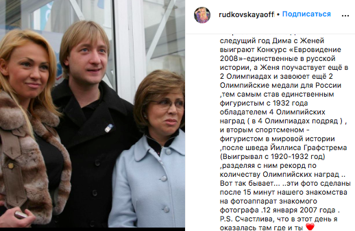 Продюсер напомнила, что через год Билан за номер с Плющенко получили первый приз на «Евровидении», а также перечислила ряд спортивных регалий своего мужа. В посте она выложила свой портрет с Евгением, сделанный, по ее словам, спустя 15 минут после их знакомства в январе 2007 года.