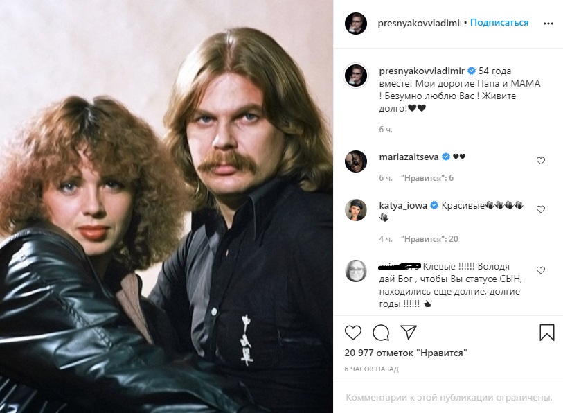 Отечественный шоу-бизнес знает уже несколько поколений семейства Пресняковых. Владимир – муж певицы Натальи Подольской, решил поздравить своих не менее звездных родителей с тем, что они вместе уже 54 года.