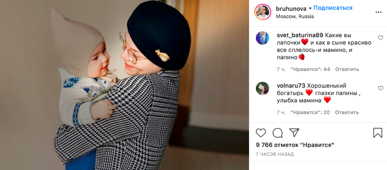На снимке Татьяна держит сына на руках, глядя в его лицо. Брухунова одета в черно-белый жакет с узором «гусиные лапки» и черный берет, на Вагане – синие вязаные ползунки, белый свитер с голубым узором и шапка-капелька.
