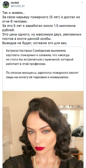 Пользователь Twitter, заявивший, что является пожарным, прокомментировал слова Настасьи. Он заявил, что за пять лет службы заработал 1,5 млн рублей, однако при этом спас шестерых человек из огня.