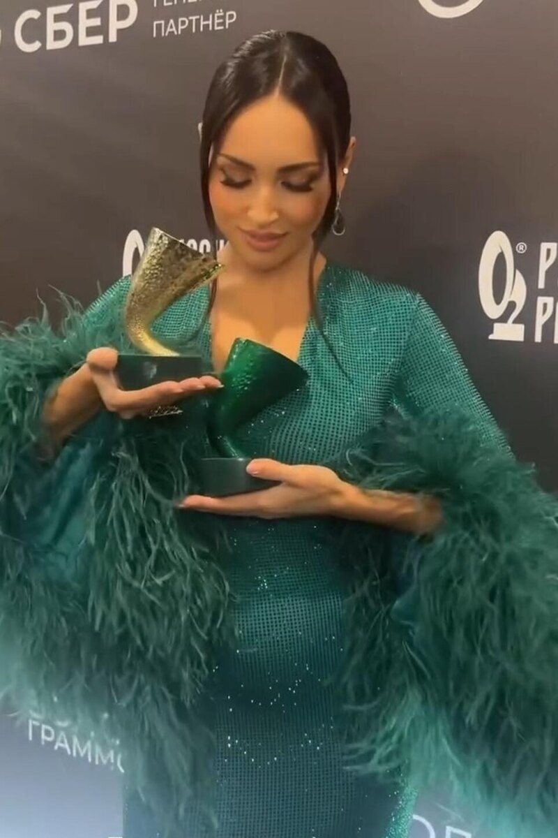 На церемонию певица выбрала облегающее платье изумрудного цвета с перьями и глубоким декольте.