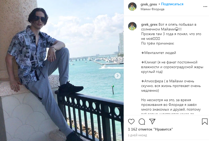 И третьей причиной является атмосфера самого Майами, ведь жизнь там течет очень размеренно и скучно. Но даже, несмотря на это Архипу удалось завести множество друзей во Флориде.