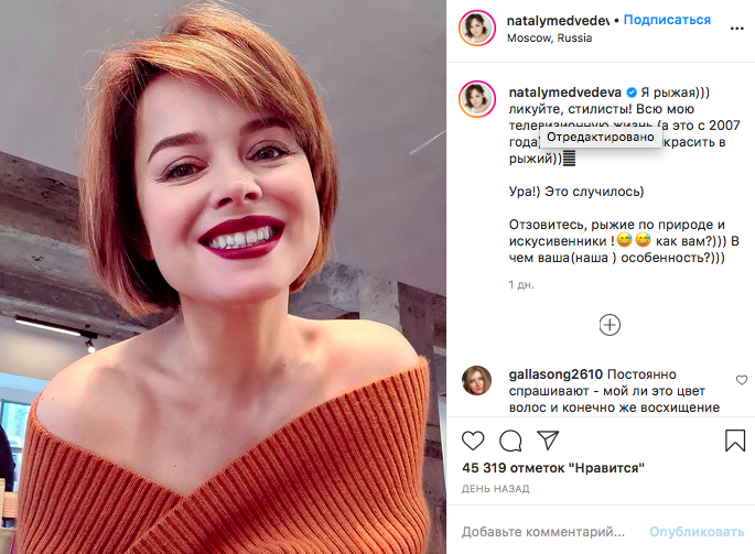 Актриса театра, кино, телевидения, телеведущая, комик, экс-участница шоу Comedy Woman и КВН Наталия Медведева удивила поклонников резким изменением образа. На опубликованной накануне фотографии она предстала с рыжим цветом волос.