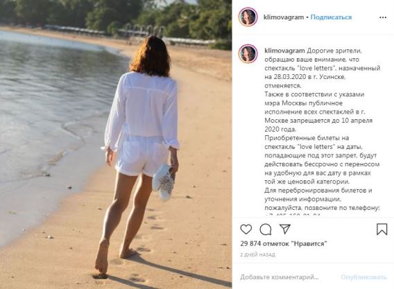 Екатерина сфотографирована со спины, идущей по побережью моря. Актриса одета в белую рубашку и такого же цвета шорты. Такой наряд подчеркивает стройные ноги Климовой. Подписывая фото, Екатерина сообщила поклонникам об отмене или переносе спектаклей с ее участием до 10 апреля в связи с распоряжением коронавируса.