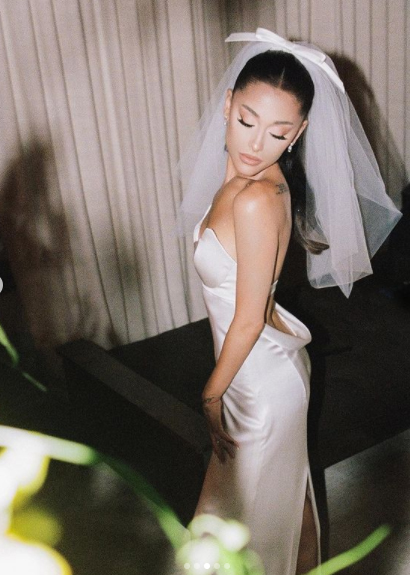 На фото Гранде позирует в минималистичном платье с открытой спиной, которое создано знаменитым дизайнером Верой Вонг. Образ певицы дополнила фата с нежным бантом, фирменный высокий хвост и аккуратные стрелки.