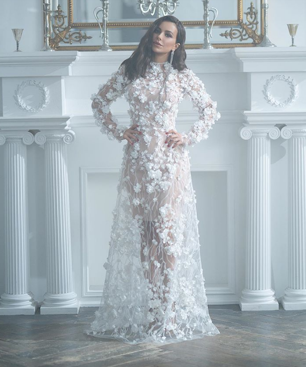 На фото можно увидеть, как певица позирует стоя и сидя на стуле. Прозрачное белое платье расшито цветами, оно надето поверх нижнего белья в тон кожи.