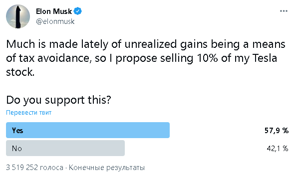 Ранее Илон Маск написал, что «в последнее время много говорится о нереализованной прибыли как о средстве ухода от уплаты налогов», в связи с этим он предложил продать 10% своих акций Tesla.