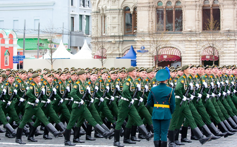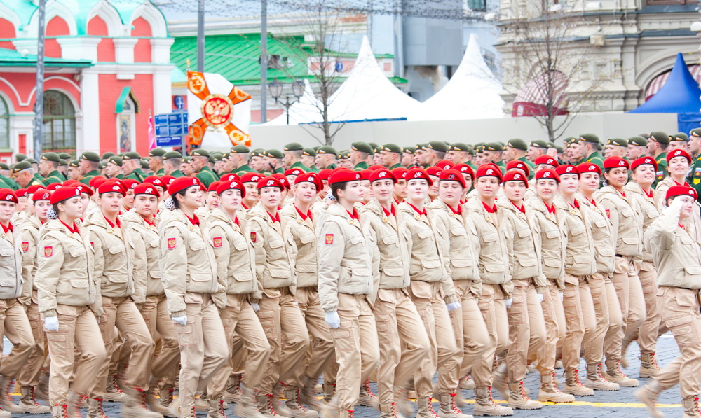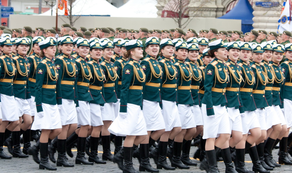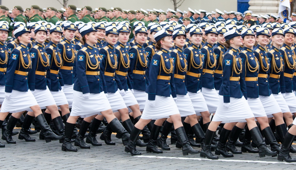 В парадном строю прошли женщины-военнослужащие — курсанты пяти высших военных учебных заведений. Сегодня в российской армии служат более 40 тысяч женщин.