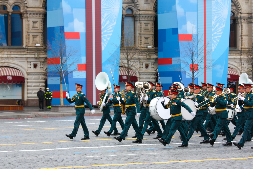 Завершает пеший парад военнослужащих проход Сводного военного оркестра.