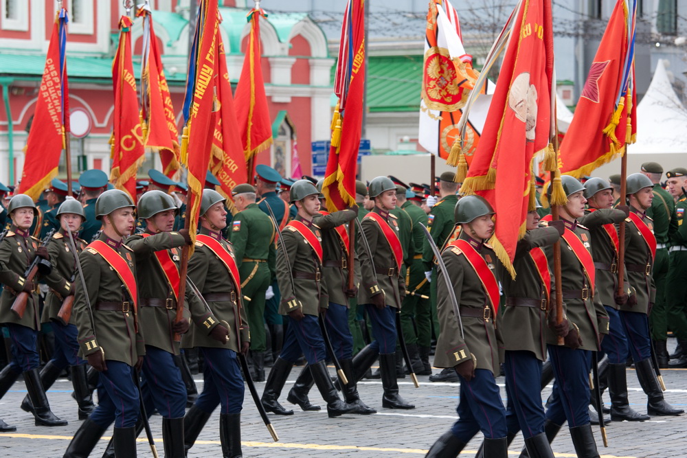 По Красной площади проносят государственный флаг России, знамя Победы и знамя вооруженных сил.