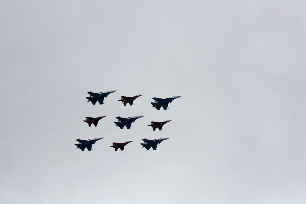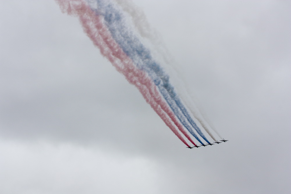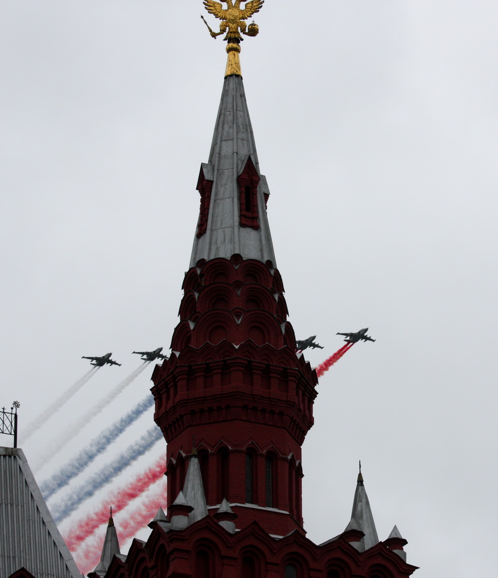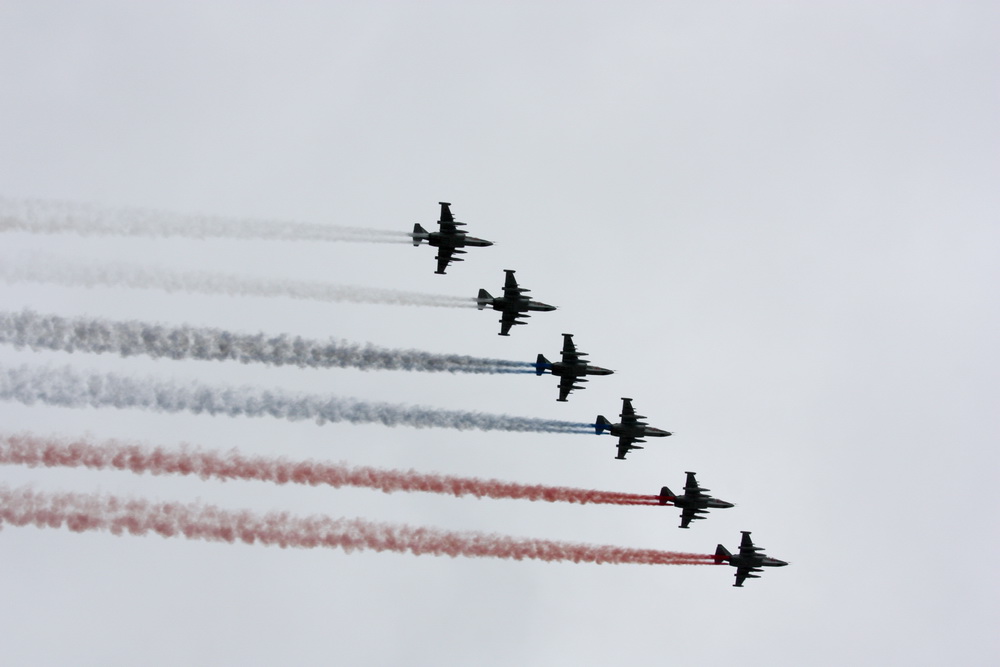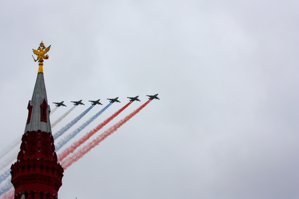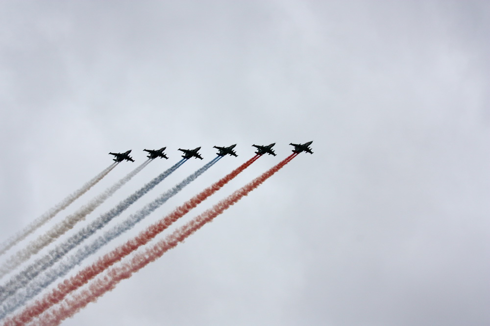 Финал авиационной части парада – яркий пролет штурмовиков Су-25БМ, раскрасивших небо в цвета российского триколора.