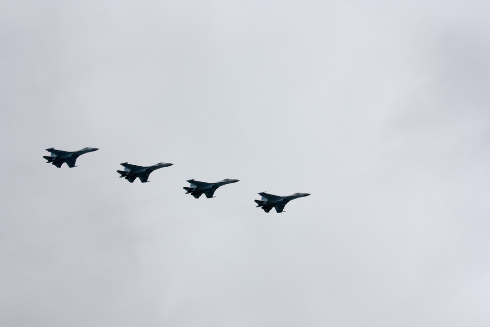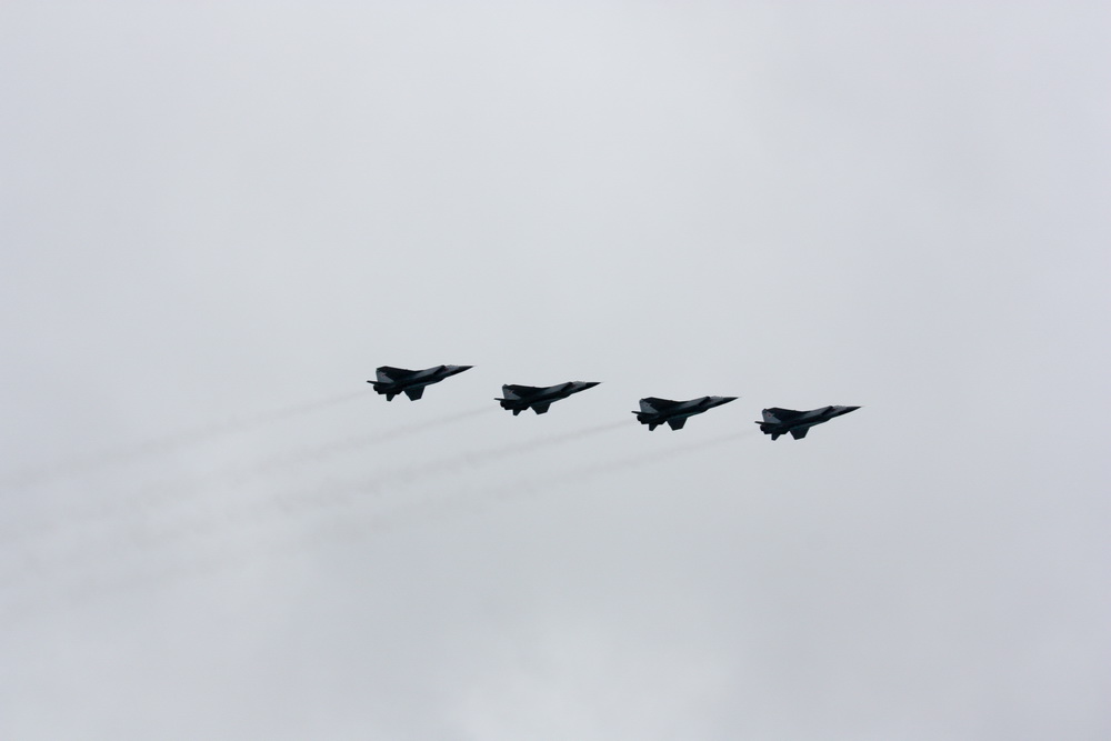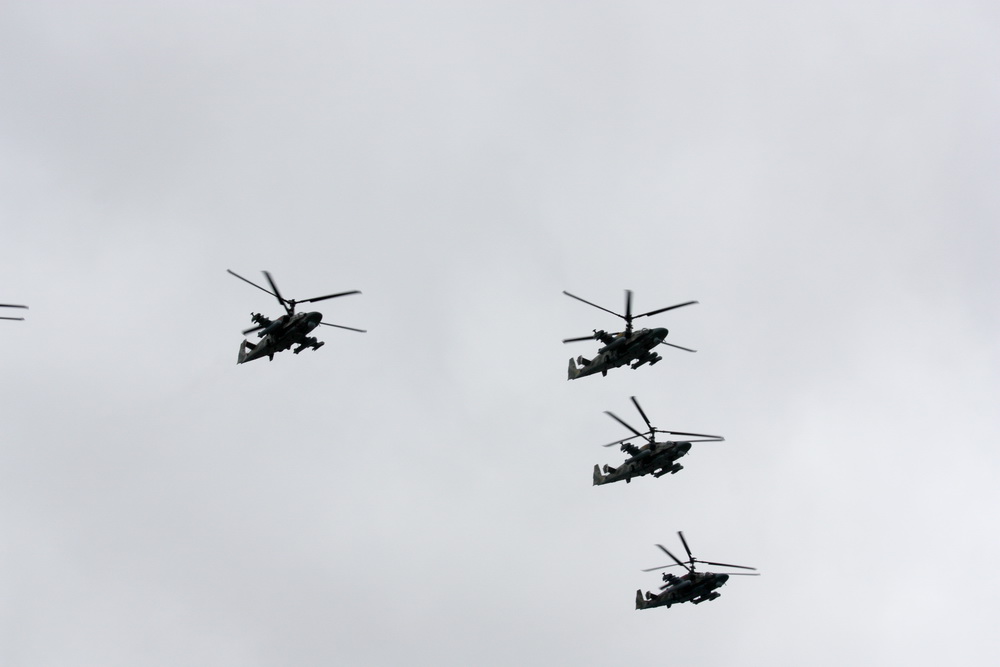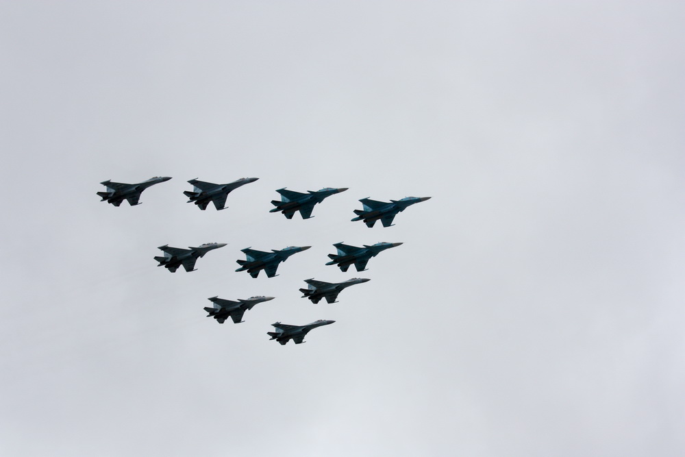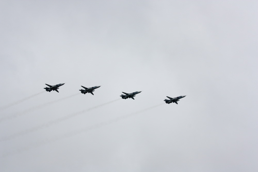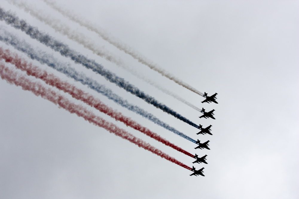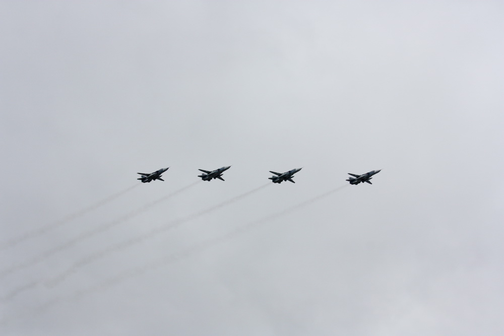 Финал авиационной части парада – яркий пролет штурмовиков Су-25БМ, раскрасивших небо в цвета российского триколора.