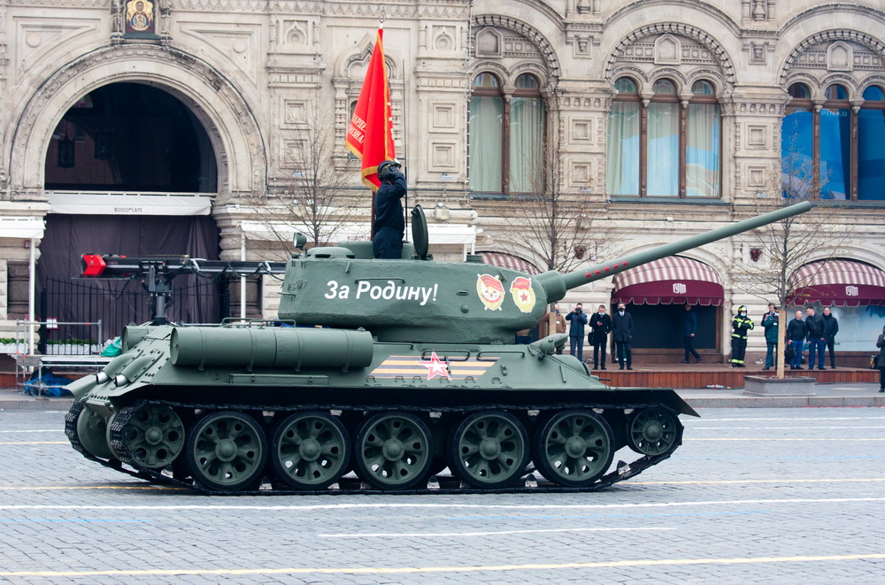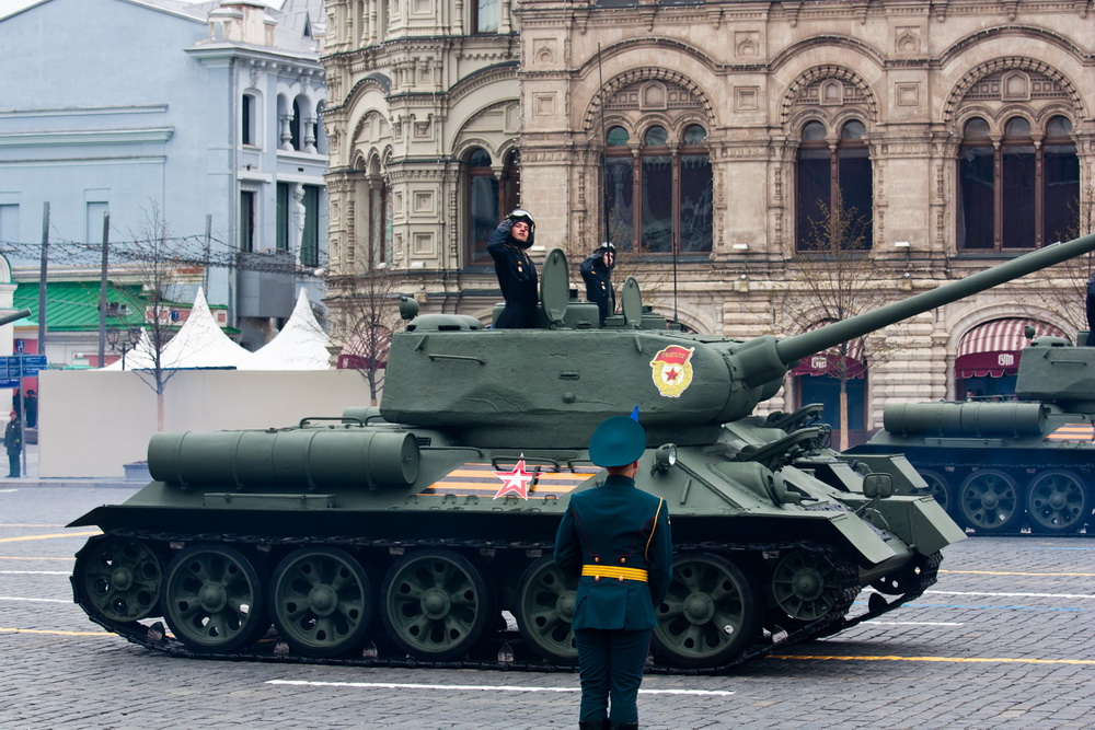 Традиционно первыми на Красную площадь выезжают легендарные танки Т-34-85.