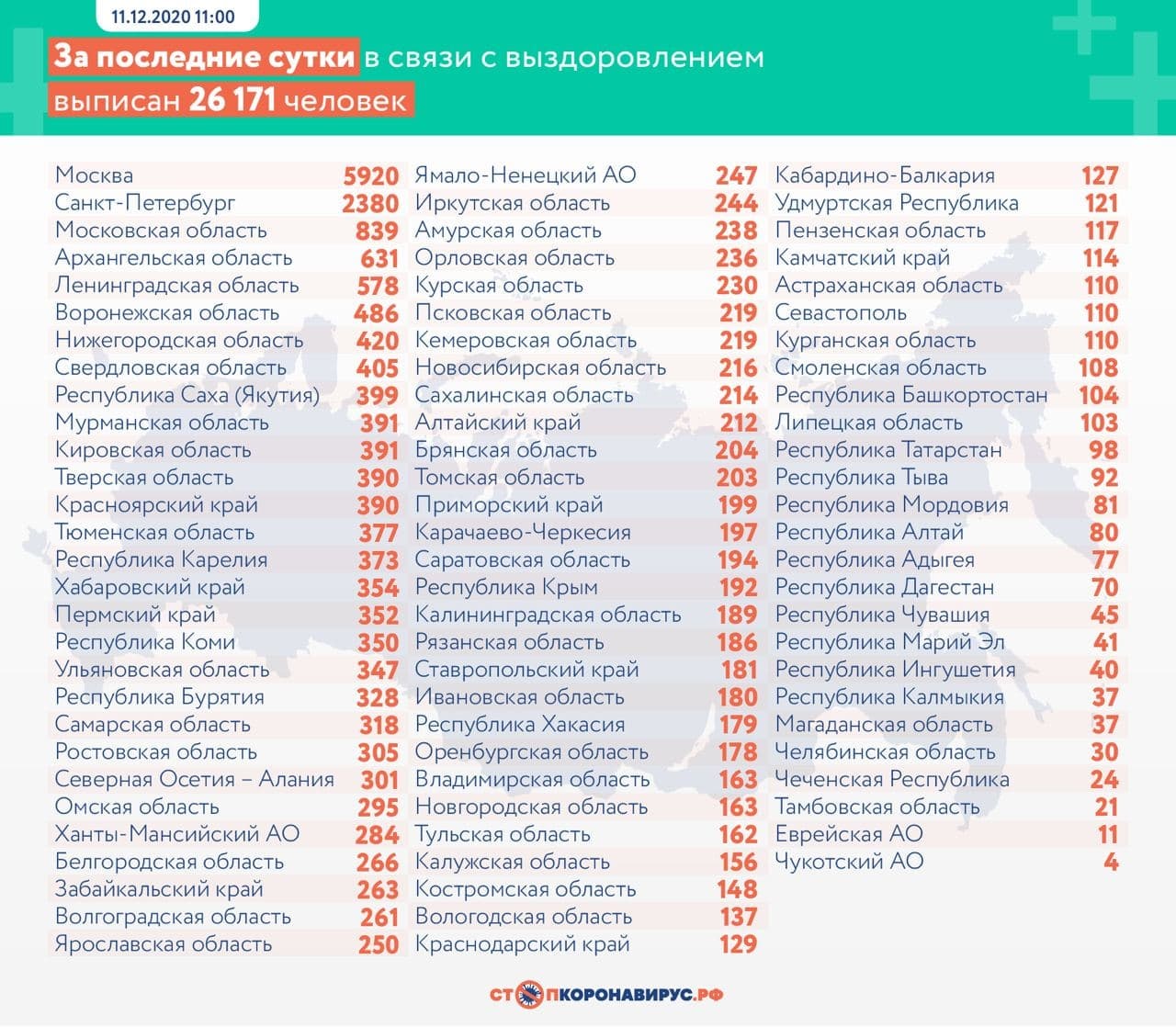 За прошедшие сутки выписано из медучреждений по выздоровлению от коронавируса 26 171 россиян. Всего выздоровели 2 059 840 россиян.