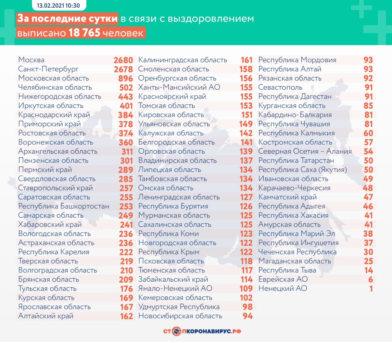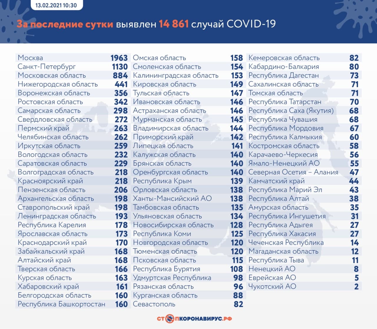 По сравнению с 12 февраля зарегистрированная заболеваемость, по официальным данным, снизилась на несколько сотен человек – накануне в России выявили 15 089 случаев заражения.