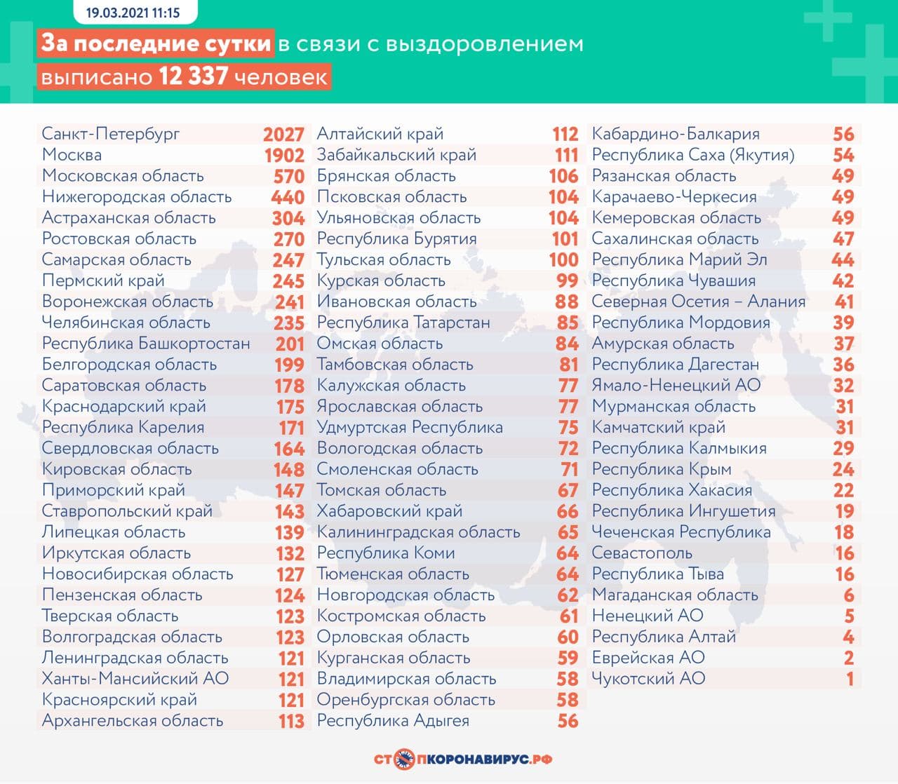 За сутки также от болезни скончались 443 человека, с начала эпидемии число смертельных исходов составляет 94 267 человек. С болезнью за сутки справились 12 337 человек, с начала эпидемии из больниц выписаны 4 049 373 человек.