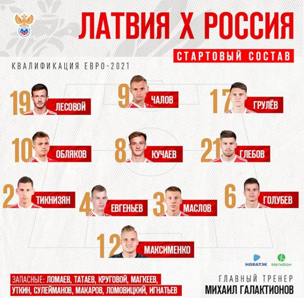 Место в воротах займет игрок "Спартака" Александр Максименко. В защите сыграют Тикнизян, Евгеньев, Маслов и Голубев. Места в центре поля главный тренер доверил Облякову, Кучаеву и Глебову, а атакующее трио составят Лесовой, Грулев и Чалов.