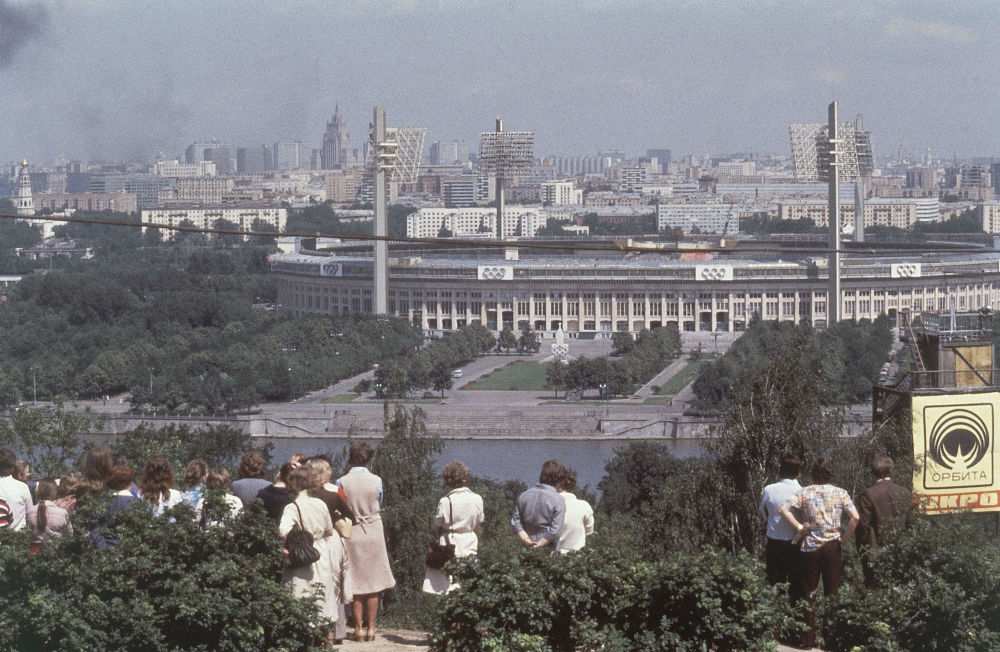 Вид на Москву-реку и стадион имени Ленина с Ленинских гор (ныне – Воробьевы горы) во время ОИ-80.