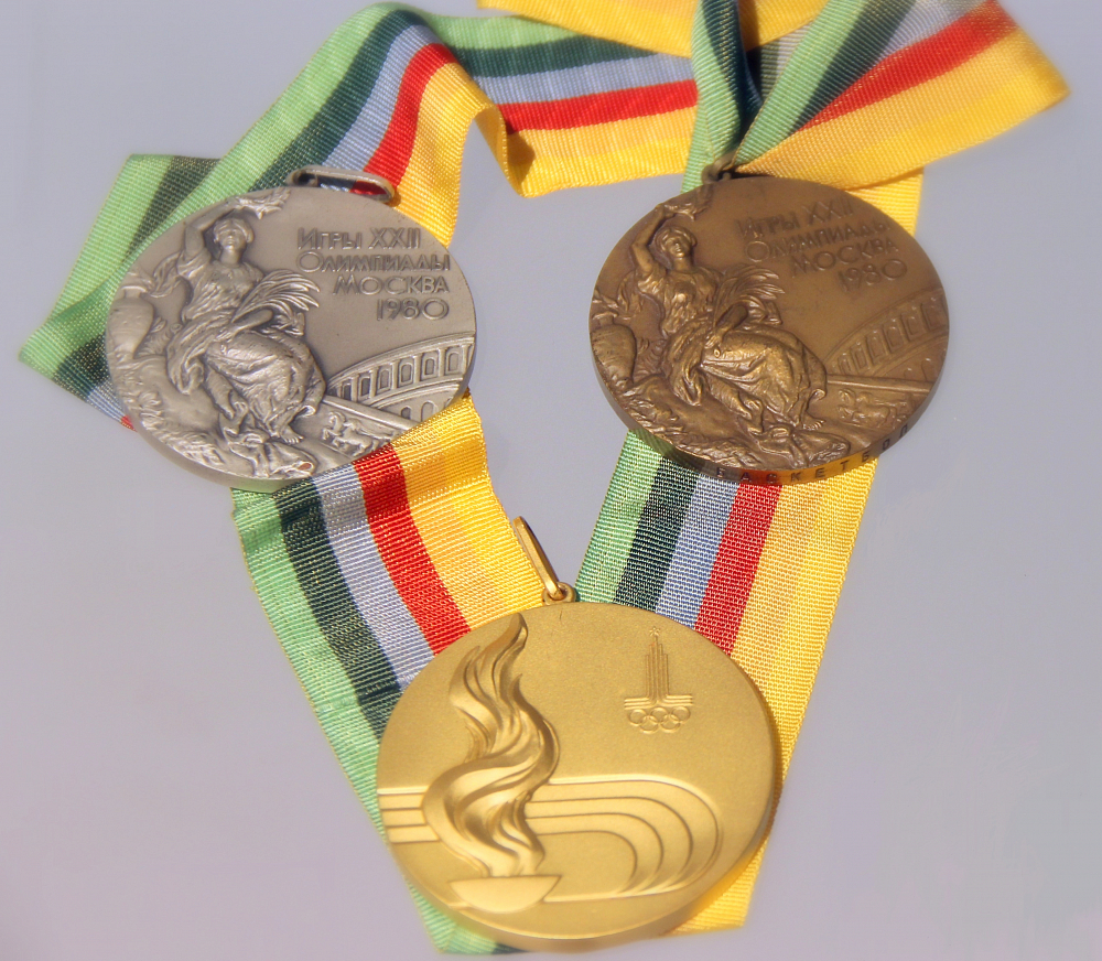 Комплект медалей Олимпиады 1980 года.