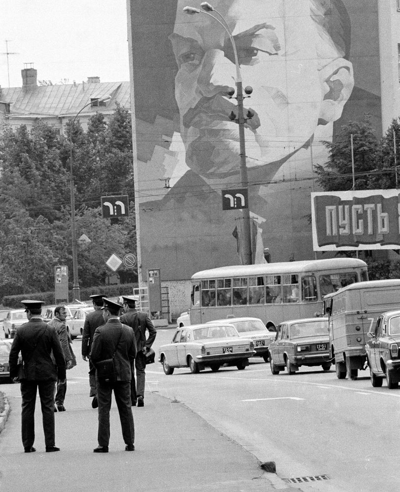 Милиционеры патрулируют столичные улицы под зорким взором Владимира Ильича. Июль 1980 года.