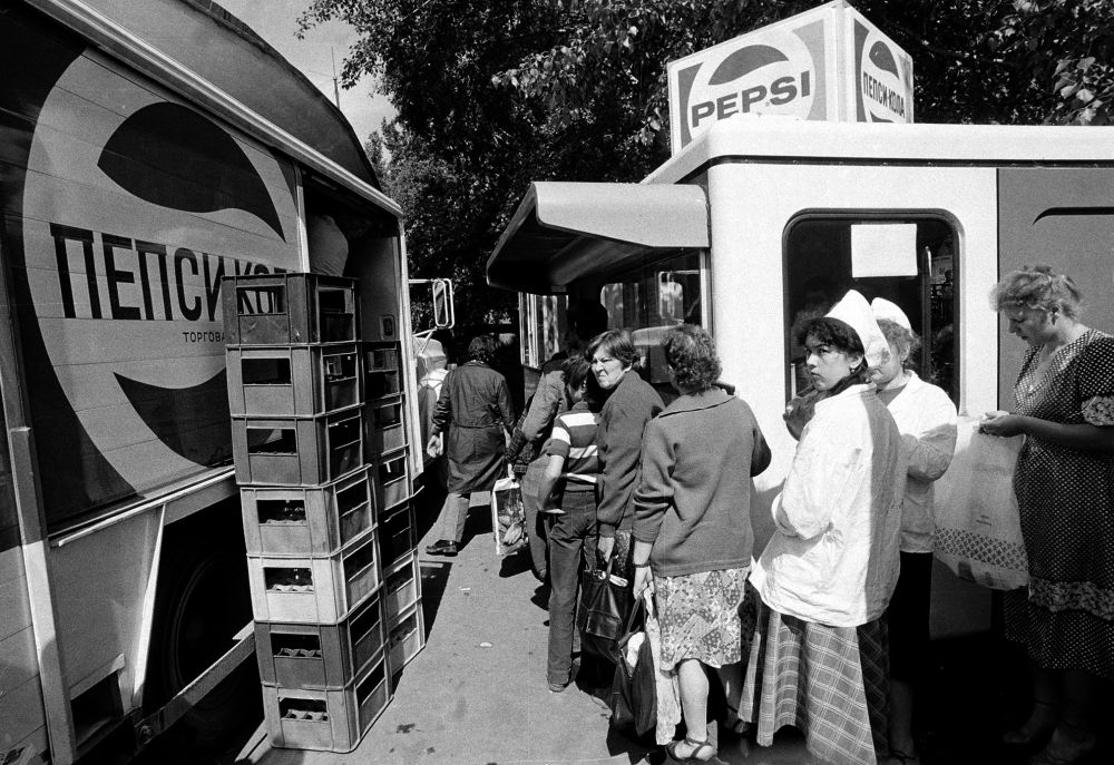 Жители Москвы стоят в очереди в один из киосков в городе, где можно купить пепси-колу, лицензию на производство которой СССР приобрел накануне Олимпиады.