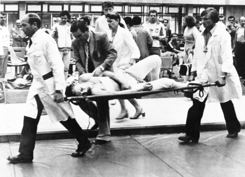 Фехтовальщик Владимир Лапицкий в схватке с поляком Богуславом Зыхом получил ранение. У соперника сломалась рапира, клинок скользнул по ребру и вышел из груди в трех миллиметрах от сердца. Пострадавшего Лапицкого уносят на носилках. К счастью, сломанная рапира не задела жизненно важных органов.