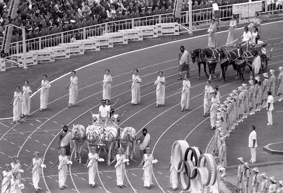 Стартовала торжественная церемония с прохода по арене юношей и девушек, облаченных в древнегреческие наряды. Их сопровождали три колесницы, в которые запрягли 12 лошадей. Во время репетиций выяснилось, что лошади активно оставляют следы своей жизнедеятельности, которые потом мгновенно растаптываются и разносятся по всей арене. Выход был найден простой и эффективный. Был придуман «окоп», в котором прятались девчонки с метелками, и в ходе церемонии они ловко выскакивали из укрытий в нужный момент, и оперативно подчищали за животными.