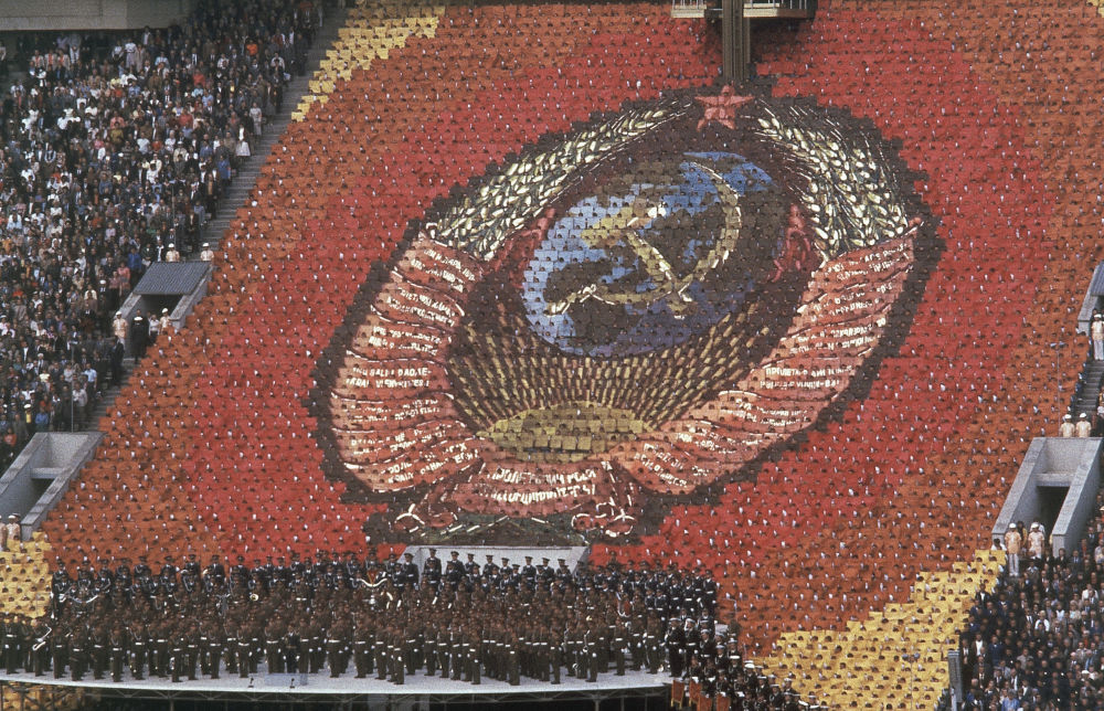 Герб СССР, созданный с помощью 3,5 тысячи человек, расположившихся на трибунах со специально подобранным реквизитом.