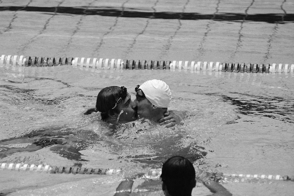 Первым чемпионом Игр в Москве в плавательном бассейне и первым в истории советского мужского плавания олимпийским чемпионом стал Сергей Фесенко. Он единственный из участников заплыва на 200 метров баттерфляем разменял гроссмейстерские две минуты. На втором снимке советские пловцы Александр Сидоренко и Сергей Фесенко целуются после того, как финишировали первыми на дистанции 400 метров.