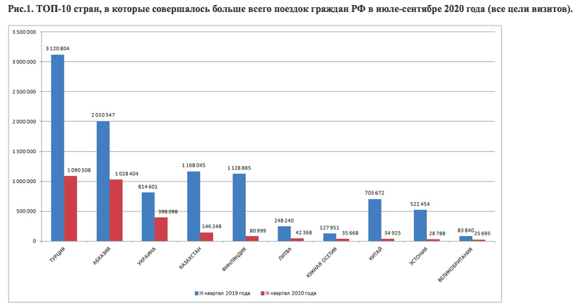 Такие данные приводит АТОР со ссылкой на Пограничную службу ФСБ России. Самой посещаемой страной стала Турция (1, 090 млн человек), Абхазия (1, 028 млн), Украина (почти 399 тыс ), Казахстан (146, 2 тыс), Финляндия (чуть меньше 81 тыс. человек.). При этом большую часть стран россияне посещали преимущественно с деловыми визитами.