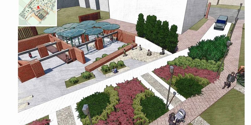 Под модульным навесом установят скамьи, урны, городские качели, шезлонги, вендинговые автоматы. Также посадят 40 деревьев. На территории сделают амфитеатр и пространство для проведения выставок. Для этого используют стены бывшего аптечного склада.