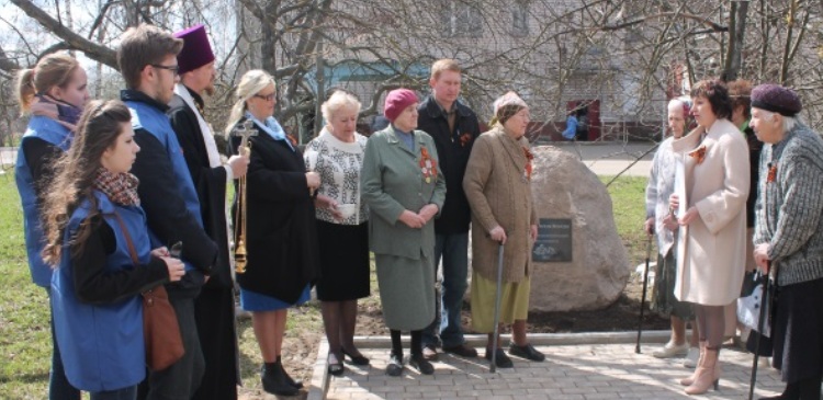 Во дворе-дома интерната инициаторы акции также установили памятный знак, напоминающий о юбилее Победы. Памятник и деревья были благословлены и освящены служителем церкви.